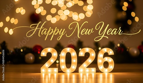Naklejka premium Happy New Year 2026 - Festive Lights Typography