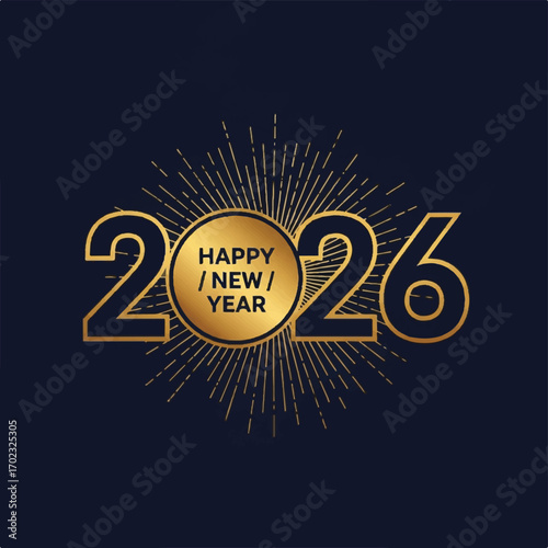 Fototapeta premium 2026 Happy New Year graphic design with gold accents and sunburst effect.