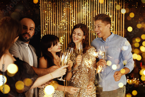 © New Africa, Fototapeta premium Happy New Year 2026 greeting card, bokeh lights. Friends celebrating with sparklers and wine glasses indoors
