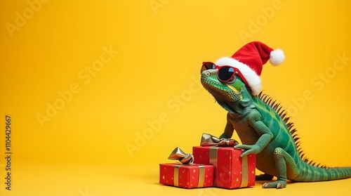 © mischenko, Naklejka premium Happy New Year 2025 greeting card, cool chameleon reptile in Santa hat, sunglasses and gifts on yellow background