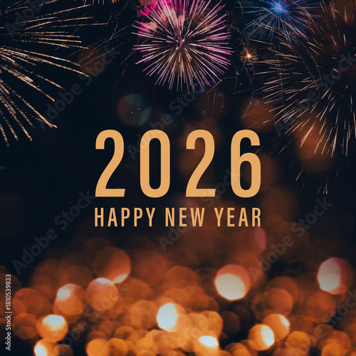 © New Africa, Fototapeta premium Happy New Year 2026 greeting card with fireworks and bokeh lights on dark background