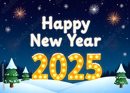 Fototapeta premium Happy 2025 New Year greeting card with winter theme, snowflake, stars, and...