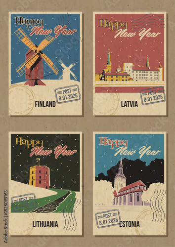 Fototapeta premium Happy New Year Greeting Cards, European Countries Main Attractions Postcards Retro Style Illustrations. Finland Windmills, Latvia Riga Castle, Lithuania Gediminas Tower, Estonia Olaf Church