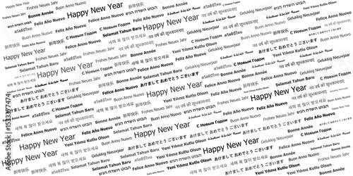 © Danawan Purbanggoro, Fototapeta premium Happy New Year in Multiple Languages Word Cloud Design