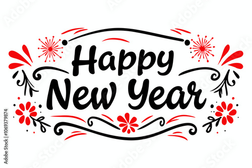 © Chayon Sarker, Obraz premium "Happy New Year" lettering with some elements, flowers and fireworks