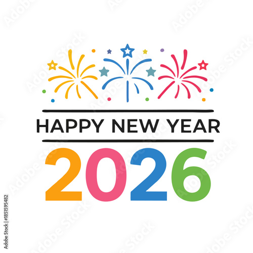 © Rieharts, Naklejka premium Happy New Year 2026 Logo, Minimalist Fireworks Icon Combined With Text, Simple Line Art, Flat Vector