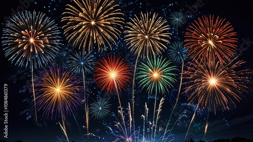 © Riki Creative, Fototapeta premium Happy New Year made of sparkles firework at night