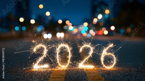 © Corri Seizinger, Naklejka premium happy new year, new year's eve, celebration holiday winter party event celebration greeting card - year 2026 sparkler font on street