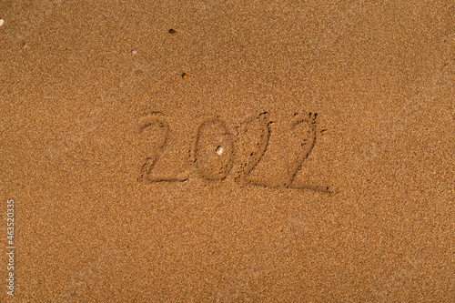 Fototapeta premium Happy New Year 2022 on the beach. Sand on a beach with a wave by the sea. Winter Vacation on the sea. New Year concept. Top view