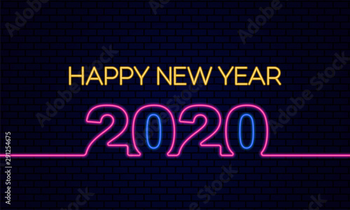 Obraz premium Happy New Year 2020 poster celebration with glowing neon light effect on dark blue brick background vector illustration