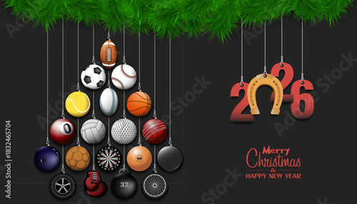 Fototapeta premium Happy New Year 2026. Soccer, football, basketball, tennis, baseball, volleyball, golf, bowling, billiard, cricket, rugby balls hanging on a Christmas tree branch. Vector illustration