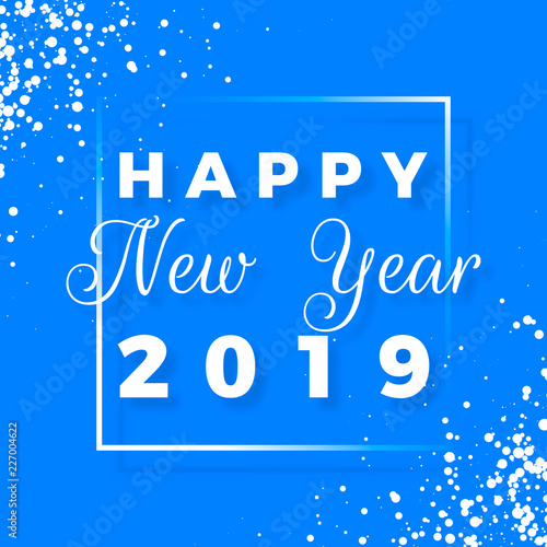 © Ihor, Fototapeta premium Happy New Year 2019 text design. Greeting card with white text and snowflake on blue background. Holiday postcard. Vector illustration