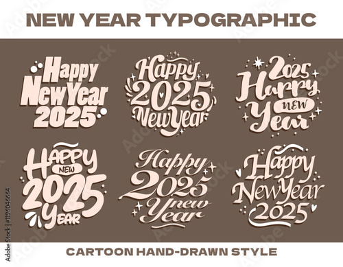 © Lin, Fototapeta premium 2025 Happy New Year typographic. Set of Handwriting style greeting text. Cute hand drawn style New Year holiday lettering Decorative retro style happy new year Calligraphy vector collection. design