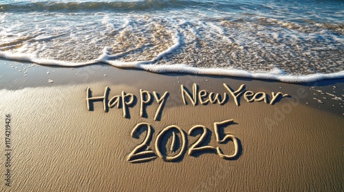 Fototapeta premium Happy New Year 2025 written in the sand on a beach with an ocean wave. Ideal for new year greetings, social media posts, and travel blogs.
