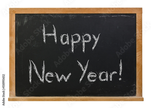 © clsdesign, Obraz premium Happy New Year written in white chalk on a black chalkboard isolated on white