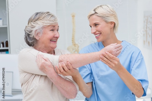 © WavebreakmediaMicro, Obraz premium Happy nurse assisting patient in raising arm