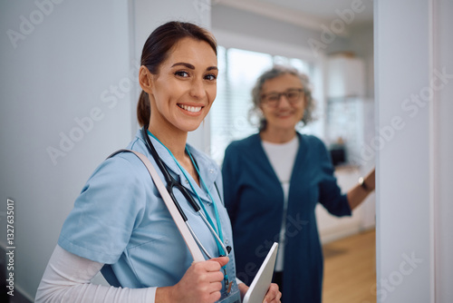 Fototapeta premium Happy nurse visiting senior woman at home and looking at camera.