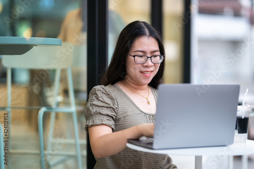 © Thinapob, Fototapeta premium Happy of asian freelance people business female casual working with laptop computer with coffee cup and smartphone in coffee shop like the background,communication concept