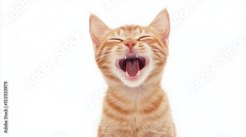 Obraz premium Happy orange cat yawning joyfully with a bright white background in a cozy...