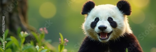 Naklejka premium Happy panda with round eyes and cheerful expression, nature, closeup