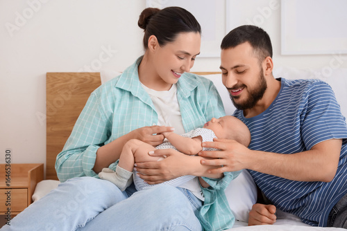 Obraz premium Happy parents with their little baby sitting in bedroom