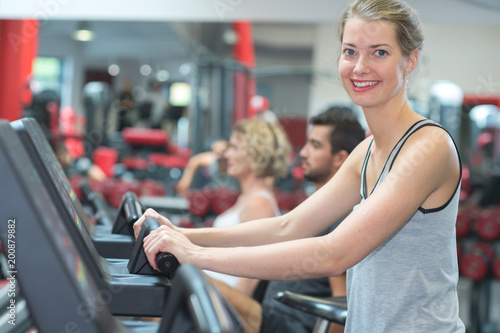 Obraz premium happy people doing indoor biking in a fitness club