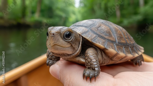 © Nattapun, Naklejka premium Happy people kayaking with a pet turtle in nature eco travel adventure lush green environment