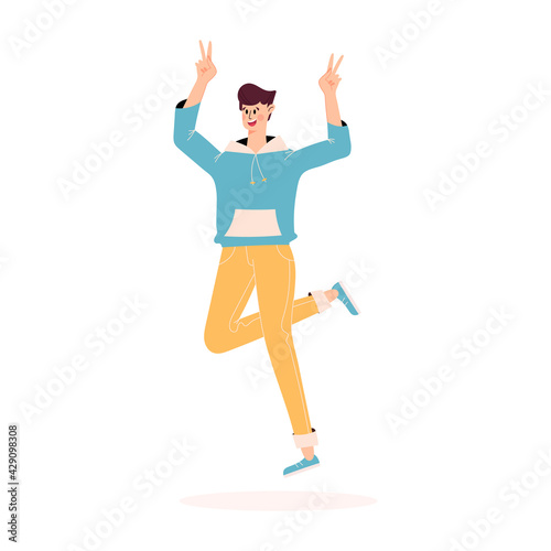 © Elena Solodovnikova, Fototapeta premium Happy person jumping. Man with raised hands jumping in the air. Positive and laughing men. Young funny teen guy celebrate victory and enjoy success. Flat vector illustration isolated on white