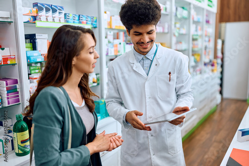Obraz premium Happy pharmacist and his female customer using touchpad in pharmacy.