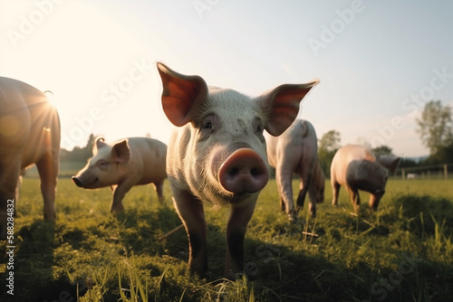 Fototapeta premium Happy pigs roaming free and farm meadow and mud. Farm animal welfare and...