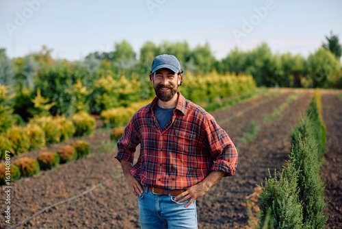 Fototapeta premium Happy plant nursery owner in field looking at camera.