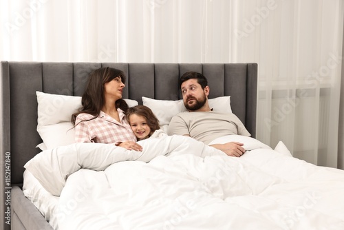 Fototapeta premium Happy playful daughter with her overwhelmed parents in bed at home