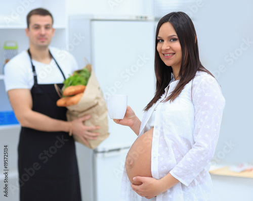 Fototapeta premium Happy pregnant couple of vegetarians in the kitchen.
