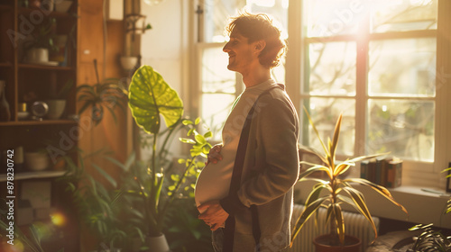 © ksu_ok, Obraz premium Happy pregnant transgender man standing in a sunlit room, radiating joy and contentment.