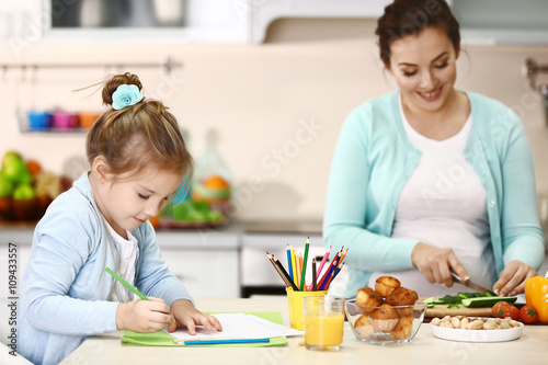 Fototapeta premium Happy pregnant woman and her child making dinner in kitchen