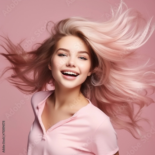 © Johannes, Fototapeta premium happy pretty cute young girl isolated on pink color background blond stunning flying hairstyle