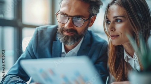 © visoot, Fototapeta premium Happy professional executive team people managing project at work. Busy business man manager leader showing financial results to female partner using laptop computer at corporate office meeting.
