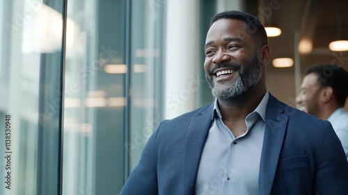 © ArtCookStudio, Naklejka premium Happy professional men enjoying conversation and laughter in a modern office environment