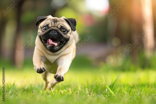 © Rachel Yee Laam Lai, Obraz premium Happy pug dog running on a green meadow grass park