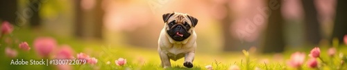© Yuwadee, Obraz premium Happy pug exploring sunny park, surrounded by blossoms , park, sun