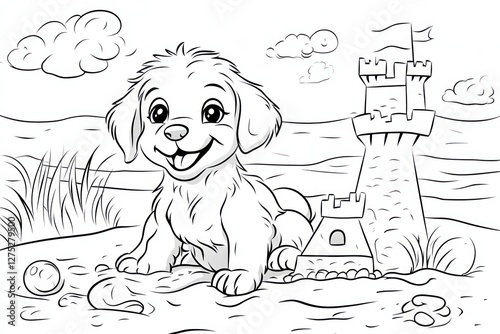 © ikk, Obraz premium Happy puppy playing on beach near sandcastle