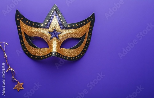 Naklejka premium Happy Purim carnival decoration concept made from mask and sparkle star on purple background.
