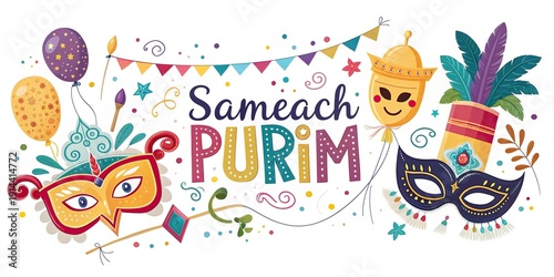 © Feoktistova, Fototapeta premium Happy Purim festive banner with carnival masks balloons and decorations.