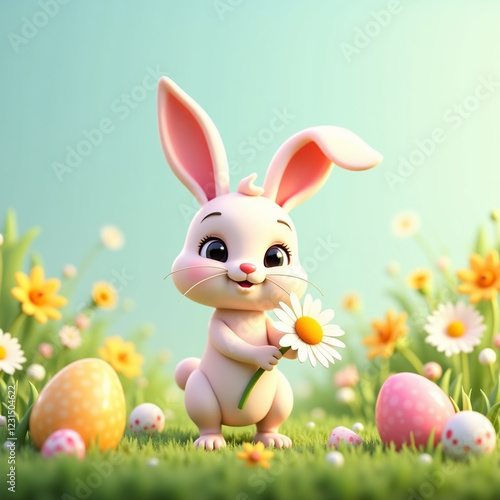 © Cozy Art, Obraz premium Happy rabbit holding flower in spring meadow