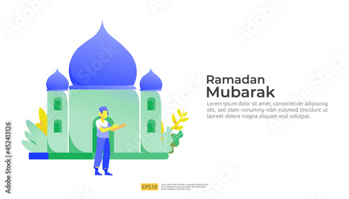 © 200degrees, Naklejka premium happy ramadan mubarak and islamic eid fitr or adha flat design greeting concept with people character for web landing page template, banner, presentation, social, and print media