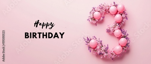 Naklejka premium Happy 3rd Birthday Floral Number Three Pink Balloons Lavender Flowers