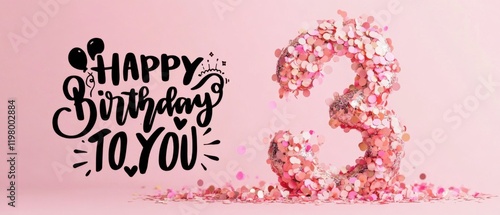 Naklejka premium Happy 3rd Birthday Pink Glitter Number Three with Confetti and Balloons
