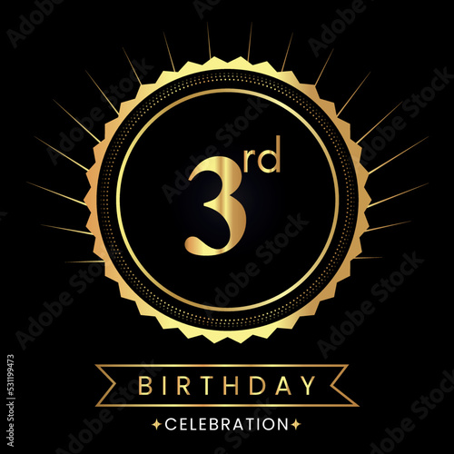 © VectoNations, Fototapeta premium Happy 3rd birthday with gold badges isolated on black background. Premium design for poster, banner, birthday card, greeting card, birthday celebrations, invitation card, congratulations.