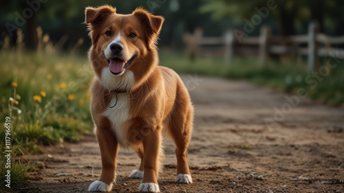 © Syarif, Naklejka premium Happy red dog standing on dirt path.