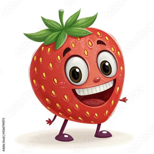 © Nishat Begum, Obraz premium Happy Red Strawberry Cartoon Character with Big Smile on a White Background